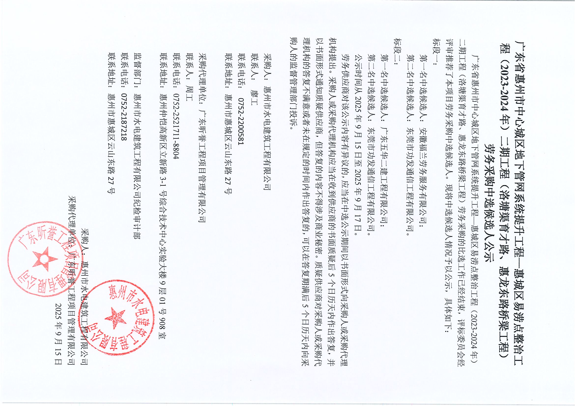 廣東省惠州市中心城區(qū)地下管網(wǎng)系統(tǒng)提升工程—惠城區(qū)易澇點整治工程(2023-2024年)二期工程(洛塘渠育才路、惠龍東路橋梁工程)勞務采購中選候選人公示