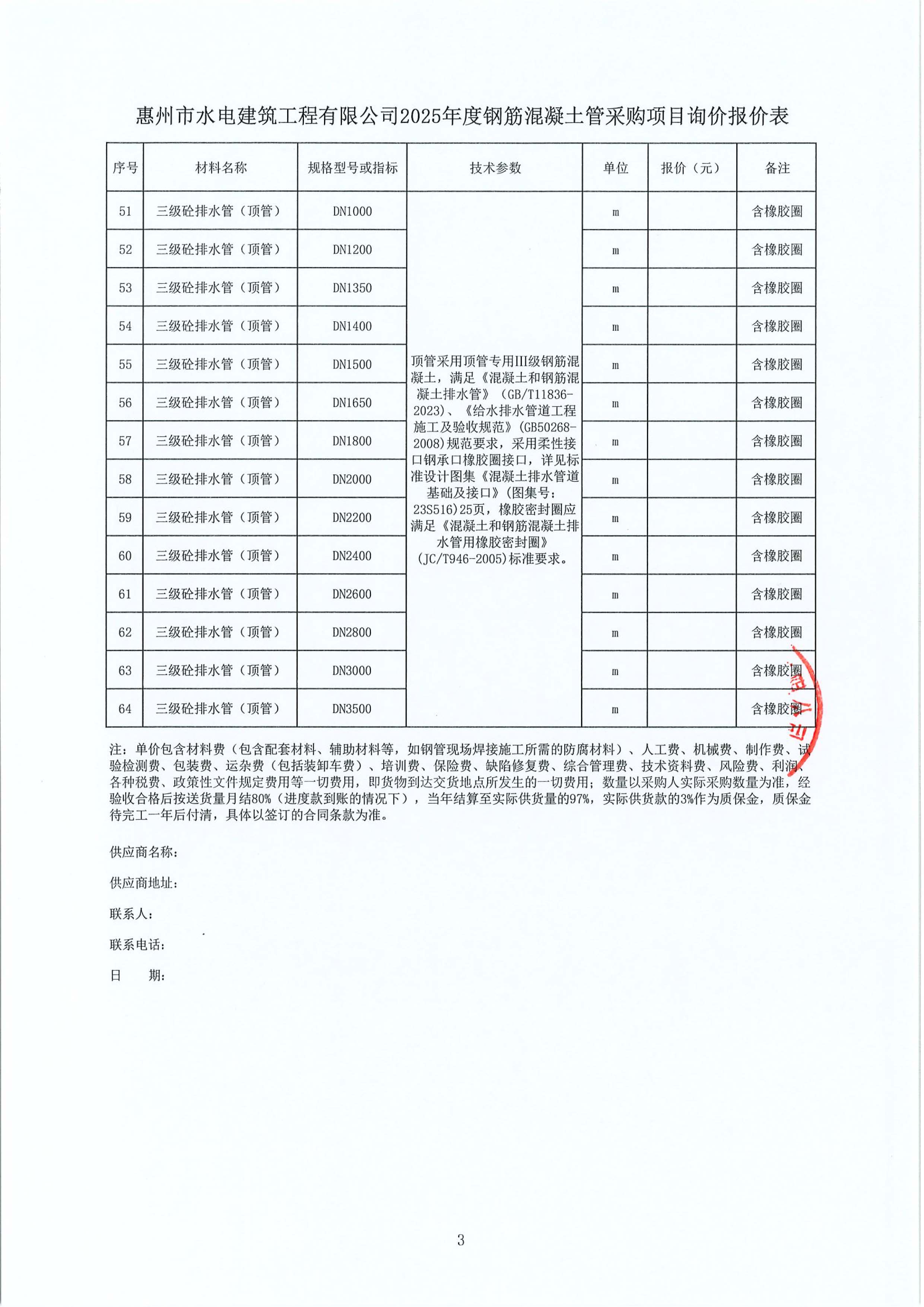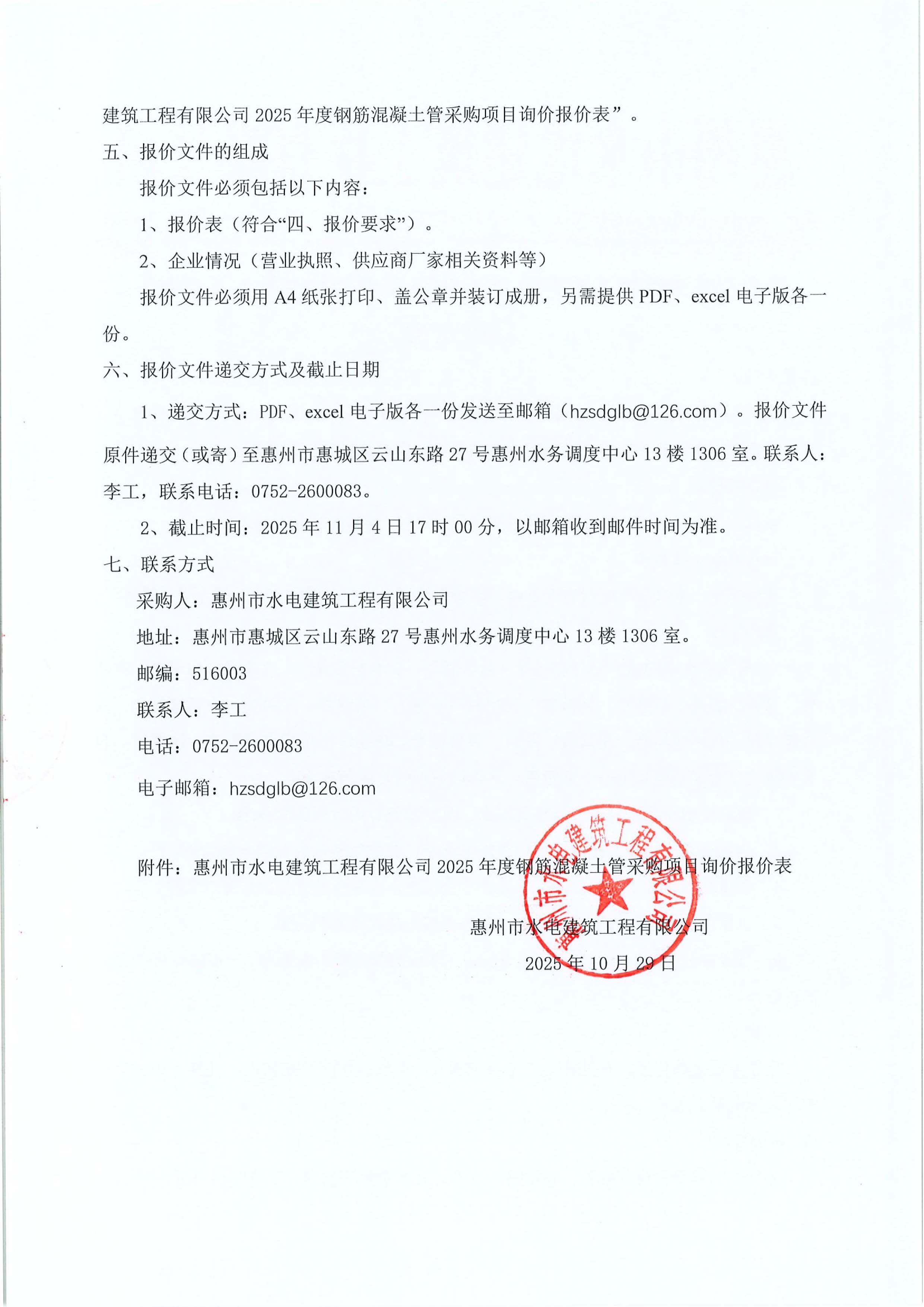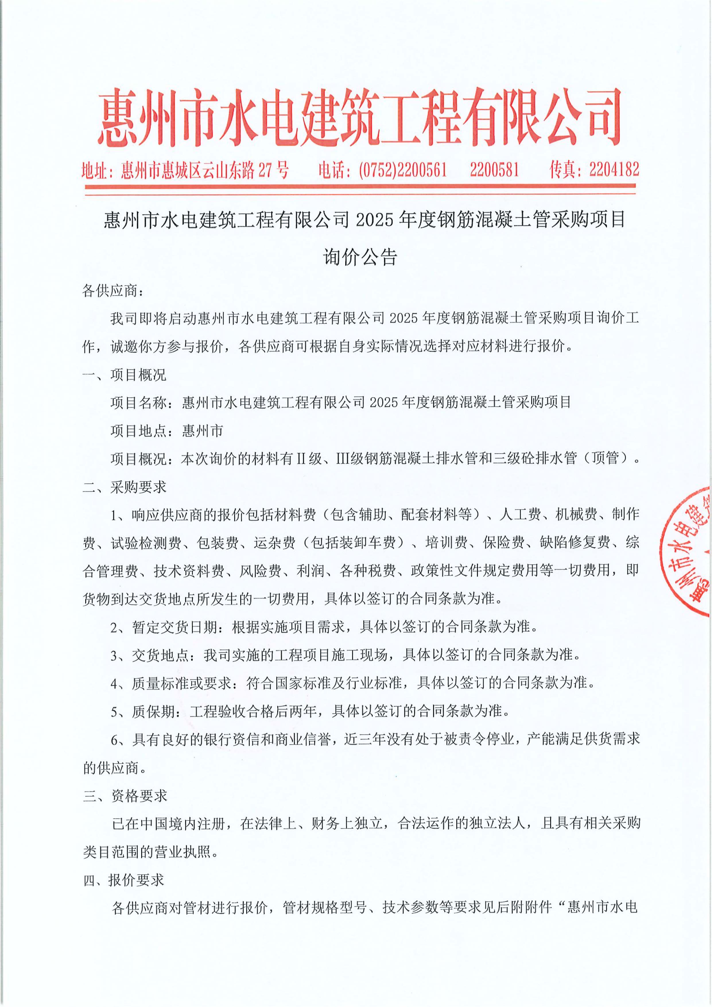 惠州市水電建筑工程有限公司2025年度鋼筋混凝土管采購項(xiàng)目詢價(jià)公告附件: